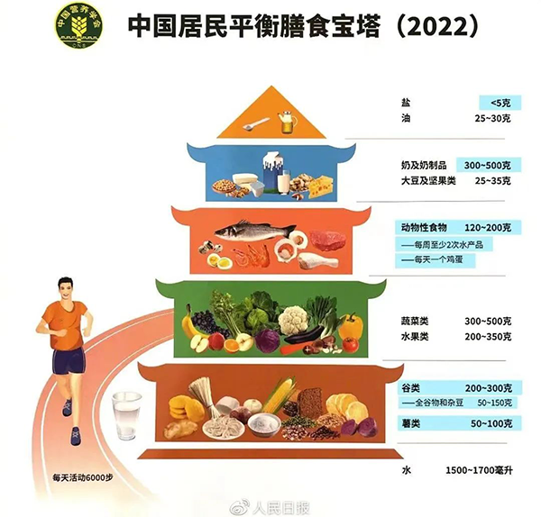 ● 每天的膳食應包括谷薯類、蔬菜水果、畜禽魚蛋奶和豆類食物。● 平均每天攝入12種以上食物,每周25種以上,合理搭配。● 每天攝入谷類食物200~300g,其中包含全谷物和雜豆類50~150g;薯類50~100g。● 各年齡段人群都應天天進行身體活動,保持健康體重。● 堅持日常身體活動,每周至少進行5天中等強度身體活動,累計150分鐘以上;主動身體活動最好每天6?000步。● 鼓勵適當進行高強度有氧運動,加強抗阻運動,每周2~3天。● 蔬菜水果、全谷物和奶制品是平衡膳食的重要組成部分。● 餐餐有蔬菜,保證每天攝入不少于300g的新鮮蔬菜,深色蔬菜應占1/2。● 天天吃水果,保證每天攝入200~350g的新鮮水果,果汁不能代替鮮果。● 吃各種各樣的奶制品,攝入量相當于每天300ml以上液態(tài)奶。● 經(jīng)常吃全谷物、大豆制品,適量吃堅果。● 魚、禽、蛋類和瘦肉攝入要適量,平均每天120~200g。● 每周最好吃魚2次或300~500g,蛋類300~350g,畜禽肉300~500g。● 優(yōu)先選擇魚,少吃肥肉、煙熏和腌制肉制品。● 培養(yǎng)清淡飲食習慣,少吃高鹽和油炸食品。成年人每天攝入食鹽不超過5g,烹調(diào)油25~30g。● 控制添加糖的攝入量,每天不超過50g,最好控制在25g以下。● 兒童青少年、孕婦、乳母以及慢性病患者不應飲酒。成年人如飲酒,一天飲用的酒精量不超過15g。● 合理安排一日三餐,定時定量,不漏餐,每天吃早餐。● 規(guī)律進餐、飲食適度,不暴飲暴食、不偏食挑食、不過度節(jié)食。● 足量飲水,少量多次。在溫和氣候條件下,低身體活動水平成年男性每天喝水1?700ml,成年女性每天喝水1?500ml。● 推薦喝白水或茶水,少喝或不喝含糖飲料,不用飲料代替白水。● 在生命的各個階段都應做好健康膳食規(guī)劃。● 認識食物,選擇新鮮的、營養(yǎng)素密度高的食物。● 學習烹飪、傳承傳統(tǒng)飲食,享受食物天然美味。● 選擇新鮮衛(wèi)生的食物,不食用野生動物。● 做可持續(xù)食物系統(tǒng)發(fā)展的踐行者。