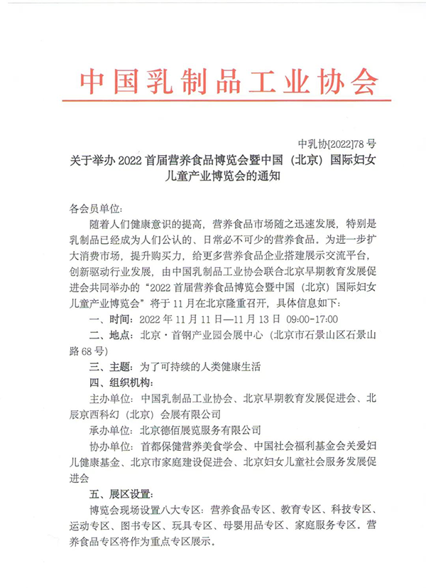關于舉辦2022首屆營養食品博覽會暨中國(北京)國際婦女兒童產業博覽會的通知